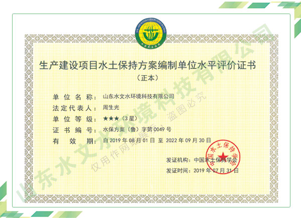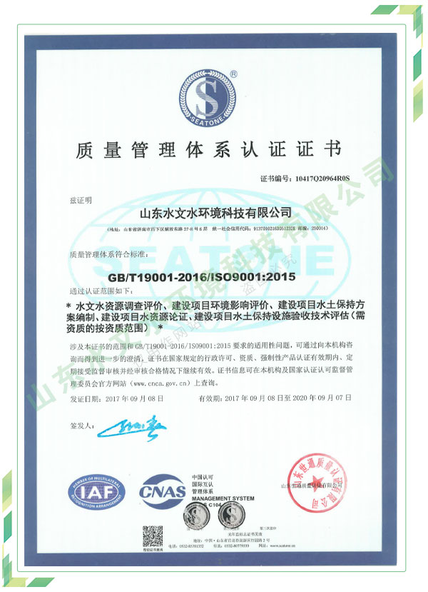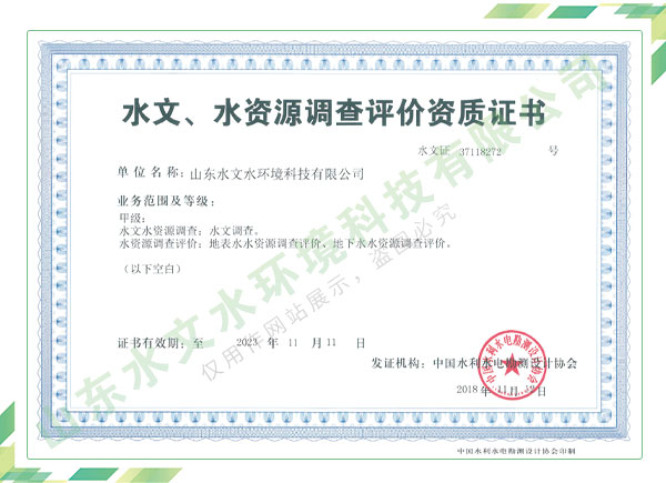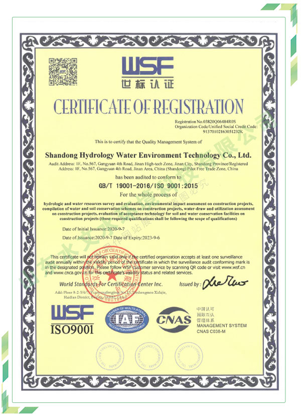 公司擁有水利工程設(shè)計(jì)、水土保持、水文水資源調(diào)查評價(jià)、水資源論證、建設(shè)項(xiàng)目環(huán)境影響評價(jià)、市政公用工程施工總承包、水利水電工程施工總承包、電子與智能化工程專業(yè)承包等資質(zhì),2017年通過質(zhì)量管理體系、環(huán)境管理體系、職業(yè)健康安全管理體系認(rèn)證;2020年被評為國家級高新技術(shù)企業(yè),同年被中國水利企業(yè)協(xié)會推薦為第一批“合同節(jié)水服務(wù)企業(yè)”;2021年被山東省、濟(jì)南市評為 “專精特新”中小企業(yè)。業(yè)務(wù)范圍涉及水利工程設(shè)計(jì);節(jié)水設(shè)計(jì)、改造、水平衡測試;山洪災(zāi)害調(diào)查;城市水資源調(diào)查評價(jià);建設(shè)項(xiàng)目水土保持方案編制、監(jiān)測、驗(yàn)收、水土保持規(guī)劃;水安全保障規(guī)劃、建設(shè)項(xiàng)目水資源論證、規(guī)劃水資源論證;建設(shè)項(xiàng)目環(huán)境影響評價(jià);入河排污口論證;防洪影響評價(jià);市政公用工程施工、水利水電工程施工、電子與智能化工程施工等。